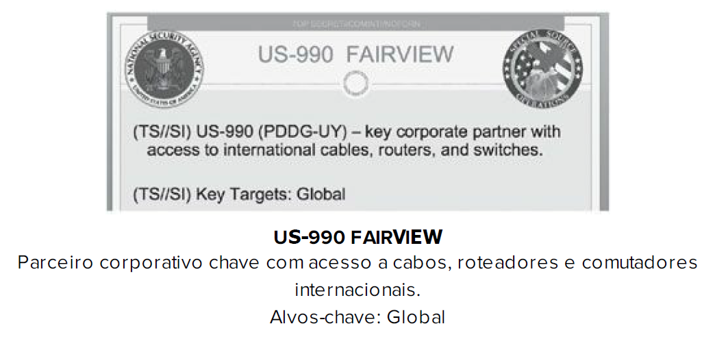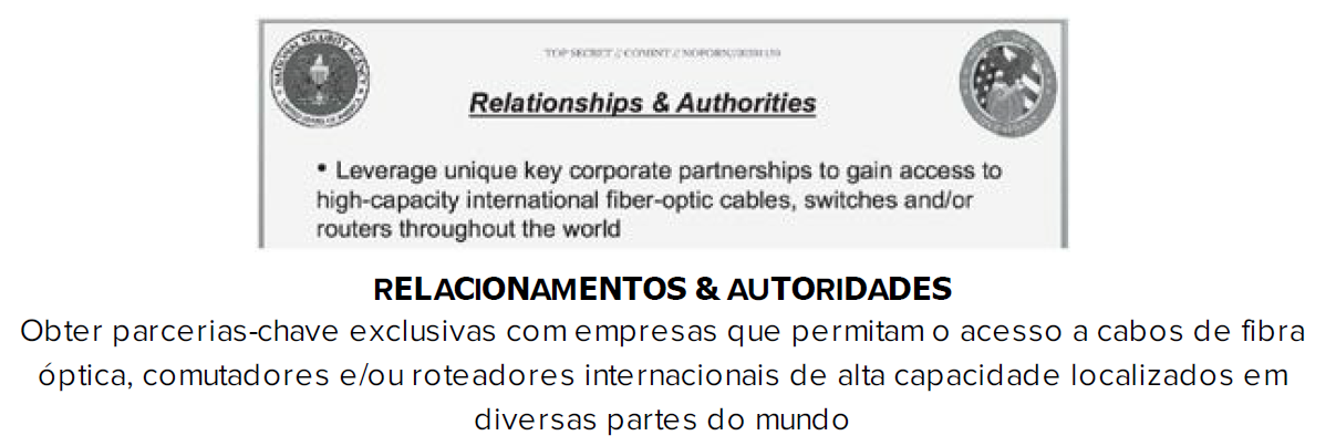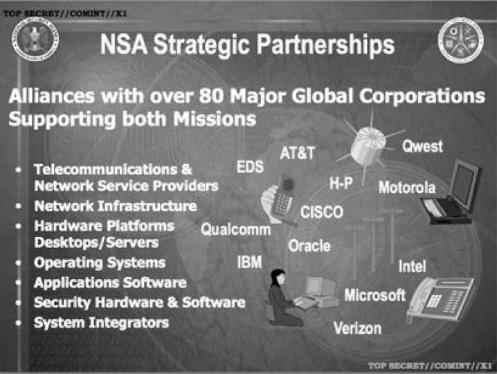 Além das prestadoras de serviço de inteligência e defesa, essas parcerias corporativas incluem também algumas das maiores e mais importantes empresas de internet e telecomunicações, justamente aquelas que processam a maior parte das comunicações do mundo e podem facilitar o acesso a dados pessoais. Após descrever as missões da agência – “Defensiva” (proteger os sistemas de telecomunicações e computadores dos Estados Unidos de qualquer exploração) e “Ofensiva” (interceptar e explorar sinais estrangeiros – , um documento ultrassecreto da NSA enumera alguns dos serviços fornecidos por essas empresas: