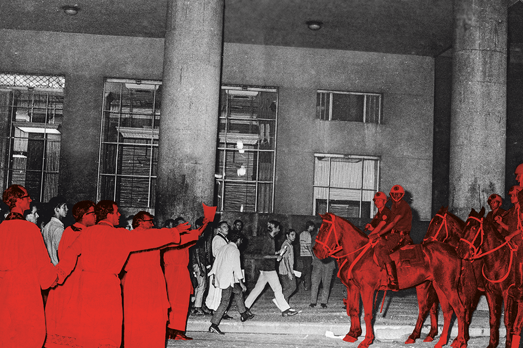 “E aí eu fiquei no centro do portal e eles, assim com armas, querendo entrar. Eu disse: não posso permitir. Vocês têm algum mandado policial (sic) para entrar aqui? Porque eu nem invoco a natureza de templo religioso, mas domicílio civil. Aí, um tenente disse assim: ´mas que mandado judicial? O senhor está dando abrigo a vagabundos que estão fazendo encrencas na rua e tumultuando…` E eu fiquei assim conversando com ele para dar tempo.”